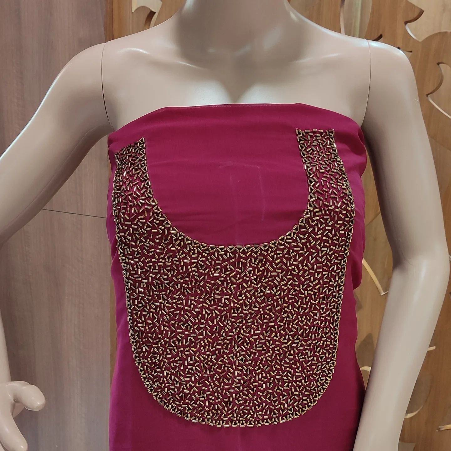 Magenta churidar fabric with embroidered U-neck yoke in gold threadwork, plain body, elegant ethnic design, festive wear.